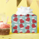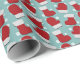 Wrapping paper with red and white Christmas mittens and Christmas stockings on a light blue background.