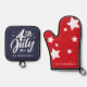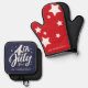 Patriotic Red White and Blue Independence Day 4th Of July theme with family name oven mitt and pot holder set. Makes a great gift or addition for this Independence Day 4th of July cook out.