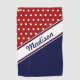 Go to the golf course in style with this USA-inspired patriotic women's golf towel. It has a red, white, and blue colour scheme with white polka dots, and the name is in a script font. Customize the name or colours in the personalization options. This is a terrific gift for her for summer golf outings, July 4th golf tournaments, or to display USA pride.