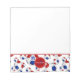 This sporty soccer balls notepad features randomly arranged red, white and blue traditional style soccer balls of varying sizes at the bottom edge of the notepad - white background is customizable, as is her name and monogram on a coordinating red circle pendant and jersey number on one of the soccer balls - by katz_d_zynes