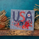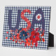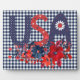 Colourful Americana tabletop plaque features USA in red and blue decorated folk art style letters with red and blue floral bouquet on navy gingham chequered background. Perfect Independence Day decor