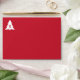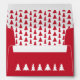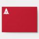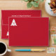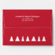 Custom red holiday card envelope features a geometric white Christmas tree with a custom monogram inside it on the top left of the front. The back flap has a customizable printed return address. On the back there is also a row of 7 white trees which goes across the bottom. Add your monogram initial, name and address in the sidebar. A modern geometric pattern of red Christmas trees on white is printed inside the envelope.