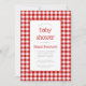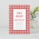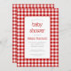 This baby shower invitation features a rustic red and white gingham checked background. The text appears in a white rectangle with a thin red border and rounded corners, with the words "baby shower" and the name of the mom-to-be in charming red typography and the remaining text in grey sans serif font. Ideal for a boy's or girl's baby shower. The gingham pattern is repeated on the back of the card.