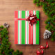 This wrapping paper design features a Christmas style striped pattern having colors like red, white, and green. Wrapping paper like this might be used when preparing presents or gifts being given to celebrate a birthday, a wedding, an anniversary, or some other event.