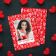 This modern and sweet Valentine's Day photo card features a red background with white hand-drawn hearts, simple typography, and one vertical photo. The back of the card has the same pattern background. You can also add another photo to the back and/or additional text to the back. This smaller size is perfect for classroom Valentines exchanges!