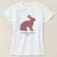 Silhouette of a red and white buffalo check gingham Easter bunny with title and name in dark blue text. This white women's Basic T-shirt style comes in Adult S to Adult 3XL and colours. Easily change or remove text using the Template provided. See "About This Product" at side for more information and care.