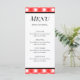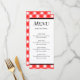 A custom menu card for birthdays, BBQ, celebrations, or restaurants with block letters on a retro red and white plaid checked pattern with wide and thin stripes, you can customize this design to add your own logo, change fonts, even save your design for later.