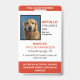 Vertical service dog ID in red and white. Add a photo of your service dog along with name, title, and registration number. Add the handler's name and contact information too.