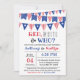 Celebrate in style with these trendy 4th of July gender reveal party invitations. The design features red, white and blue bunting flags with matching easy to edit wording on a simple white background.