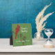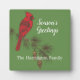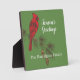 Stylish holiday tabletop art plaque features Red cardinal bird on pine branch with customizable text