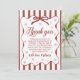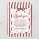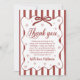 A charming red and white winter-themed first birthday thank you card featuring classic stripes, elegant script lettering, and delicate snowflake accents. Perfect for expressing gratitude after a holiday or winter one-derland celebration. Personalizable with your child’s name and message, making it a heartfelt keepsake for guests.