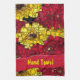 This kitchen towel template is adorned with a wonderful melding of multi-sized red, yellow and gold box design with text alerting the user that it is a "Hand Towel." Fill in the template field with your words or initials, remove all text and the red text bar or click customizeif you'd like to select a different font style, size and colour.