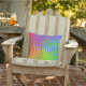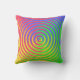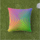 This colourful outdoor pillow features an abstract spiral rainbow pattern swirling around a central target in colours of green, blue, yellow, orange and red.