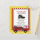 Red and yellow striped firetruck/fireman child's 4th birthday party invitation postcard. Text says, "Sound the alarm, CHILD's NAME is turning 4." Add your own instructions at the bottom. Ours says, "Bring a change of clothes. We're going to get wet." This card can be customized for a child of any age.