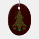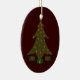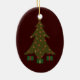 This elegant design features a quilted Christmas tree with jewel-toned ornaments adorning it and presents underneath, all surrounded by a delicate gold filigree border with jewels at the corners.