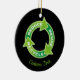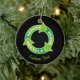 Green enviromental symbol, circle with arrows and the words reduce, reuse, recycle. Custom background colour. Custom text on both sides.