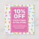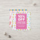 Votre commerce de sucreries regorge-t-il de délices sucrés et de bonbons prêts à être vendus? Partagez sur votre pays des merveilles de bonbons avec une carte de coupon rabais qui attirera les clients pour passer des commandes à votre boutique. Qui n'aime pas les bonbons, les chocolats, les cupcakes et les fudge ? Ce design ludique éveille la joie avec un motif de bonbons de popsicles, de crème glacée, de sucettes et de bonbons aux couleurs joyeuses qui feront que les clients se livrent à la douceur dans votre magasin. Vous pouvez ajouter cette carte d'offre spéciale dans les sacs d'attrapage d'événements et d'autres façons de faire la publicité de votre vente et obtenir plus de clients à votre confiserie physique ou en ligne ou chocolat magasin. S'est tourné vers les confiseries et les boulangeries qui vendent des produits de boulangerie, des cupcakes, des bonbons, des chocolats, des glaces et d'autres compagnies de sucreries et de desserts. La carte vous permet d'entrer votre pourcentage de vente, les modalités et les conditions et d'ajouter vos informations commerciales.