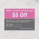 Encouragez vos clients de toilettage à diriger votre salon de toilettage de chien vers leurs amis en leur donnant un incitatif. En cliquant sur le bouton "personnaliser", vous pouvez facilement ajouter vos propres détails d'affaires et modifier votre offre de référence/réduction préférée au verso de la carte. Des outils marketing correspondants sont disponibles dans notre magasin.