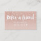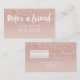 Refer a friend with this modern, stylish makeup referral card with modern hand lettering style brush typography in white on a faux rose gold glitter and pastel blush pink trendy and elegant background. If you need any customization, don't hesitate in contacting me