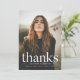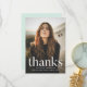 Simple and modern graduation thank you card featuring the graduate's vertical photo with "thanks" in white modern lettering. Personalize the front of the thank you card by adding the graduate's name, school name, and graduation year. The photo thank you card reverses to display your custom message with a mint green background.
