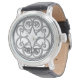 This handsome watch contains a silver pattern of interlocking rings and the word "reflect".