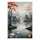 A serene landscape of gentle mountains and a tranquil lake, adorned with cherry trees with vibrant red blossoms. White swans glide across the water, creating a scene of peace and natural beauty. An invitation to contemplation and relaxation.