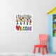 Refugees and Migrants Welcome design features stick people of many colors in friendly welcoming group - celebrating diversity, new arrivals and ensuring refugees and migrants are made welcome.