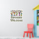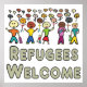 Refugees Welcome features a variety of people in a friendly group with the words "Refugees Welcome" below. A design to greet newcomers and ensure displaced people are made to feel welcome.