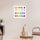 Refugees Welcome design features a diverse collection of stick people in a friendly welcoming group. The wording and colours celebrate diversity, new arrivals and aims to ensure refugees and migrants are made to feel welcome.