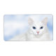 Angora, aux cheveux longs, peut-être turc, aux yeux bleus blanc étiquette photo de chat