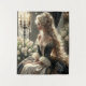 A woman in an opulent, baroque-style gown adorned with intricate lace and pearls sits gracefully on a luxurious throne. Her long, wavy hair cascades down her back, complemented by elaborate jewelry including earrings and a necklace. The setting is richly decorated with white tulips, a chandelier, and ornate drapery, evoking a sense of grandeur and historical elegance.
