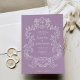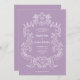 This elegant and luxe wedding invitation features a vintage line art frame with ornate baroque style. The white illustration sits on a lavender purple background. Modern script calligraphy and classic text, along with your initials or monogram, make this a classy yet up-to-date contemporary choice for your wedding.