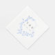 Elegant wedding napkins featuring a light blue shield crest adorned with watercolor blue leaves, with your monogram and wedding date in grey in the centre.