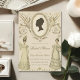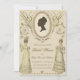 A vintage style bridal shower invitation with a Regency-era theme. The design features an elegant, antique cream-coloured background with intricate golden decorative elements, including a central oval frame that encloses a silhouette of a lady’s profile, reminiscent of Regency era portraits.