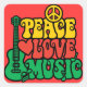 Type design of PEACE, LOVE & MUSIC with guitar, peace symbol, heart and musical notes in yellow, red and green.