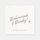 Rehearsal Dinner Napkins: These trendy, modern wedding rehearsal dinner napkins feature the playful phrase "Rehearsed & Ready" in a romantic love note-style handwriting script, accented by a sweet heart design. With a sleek black and white colour scheme, they add a stylish and fun touch to your rehearsal dinner, perfect for couples looking to blend elegance with a hint of charm and personality.