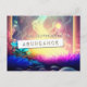 Beautiful postcard with colourful ethereal fantasy background and bold statement that says "I am surrounded by abundance." The law of attraction matches your vibration, so feel that your life is full of wealth and you will attract more money. Don't believe it? Try counting everything you are grateful for. Now can you see how many conveniences and luxuries exist in your daily life? Make a commitment of writing in your gratitude journal every day. List at least three things that you are grateful for each day. Work up to ten things a day, then get to a place where you can count one hundred wonderful things to be thankful for. Eventually, you will begin to mindfully meditate, noticing what is good and right in every single moment.