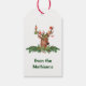 Here's a fun holiday gift tag that both kids and adults will like. It shows a watercolor image of a reindeer wearing a bright red and green scarf. The reindeer is framed by a green Holiday wreath. Your custom text is in green at the bottom. The image and text are placed on a white background. The back of the tag has a second image of the reindeer with tree ornaments on his antlers. Cute, and you may make the text say whatever you'd like! Be sure to see the matching stickers and other Christmas themed items in our store.