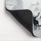 A mouse pad with a watercolor image featuring a black silhouette reindeer standing among some pine trees. Grey black and white neutral colour scheme.