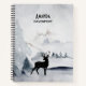 A personalized spiral notebook with a watercolor image featuring a black silhouette reindeer standing among some pine trees. Grey black and white neutral colour scheme.