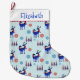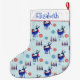 Personalized Christmas stocking with a repeating pattern. Illustrated with a pair of blue scandinavian deer wearing red scarves. With decorative markings on their bodies. As well as a trio of red and blue christmas trees with a star on top. Fancy snowflakes sprinkled around.