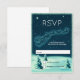 A Christmas party RSVP card with a vintage illustration of Santa in his sleigh being pulled by his reindeers. Little stars in the night sky. Snow covered pine trees on the ground. Vintage retro feel.