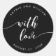 Wedding favour sticker featuring the words "with love" in a relax cursive script in white against an editable background colour (click customize to access).