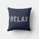 Throw pillow with "Relax" lettering in modern white urban font on dark blue background.