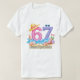 Celebrate a milestone retirement at 67 with this pastel watercolor T-shirt design featuring relaxing beach elements. Perfect for anyone retiring, this hand-painted design includes gentle waves, seashells, sunglasses, and a lounge chair, making a cheerful and stylish gift for the retiree. Ideal for casual wear, retirement parties, or commemorative apparel.