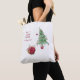 Christmas holiday tote bag featuring an exhausted rabbit relaxing on a round holiday tree ornament.