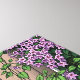 A cute ai illustration done in a comic book cartoon style of a lady drinking coffee on her patio outside with her two white cats. She is surrounded by beautiful hanging purple Clematis and other pretty plants.