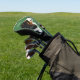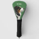 This golf head cover has a minimalistic design with a solid green background and an Australian shepherd dog illustration. It is a great design for dog owners and lovers - especially Australian shepherd owners.