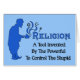 A magician spews the symbols of major religions from his lantern and is illustrated with the saying "Religion, a tool invented by the powerful to control the stupid."
