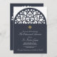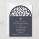 A beautiful, religious invitation, in navy blue and white, featuring a decorative arch. The gold cross can be dragged to any location, made larger or smaller (+ -), or eliminated. (<a href='https://www.freepik.com/free-vector/vector-wedding-card-laser-cut-template-vintage-decorative-elements_1317890.htm'>Designed by Freepik</a>). <br/><br/>The card is easy to customize with your wording, font andfont colour.<br/><br/>Not exactly what you're looking for? All our products can be custom designed to meet your needs at no extra charge.<br/><br/>Simply contact us at askcottonlamb@gmail.com.<br/><br/>Coordinating products available: Just ask us!